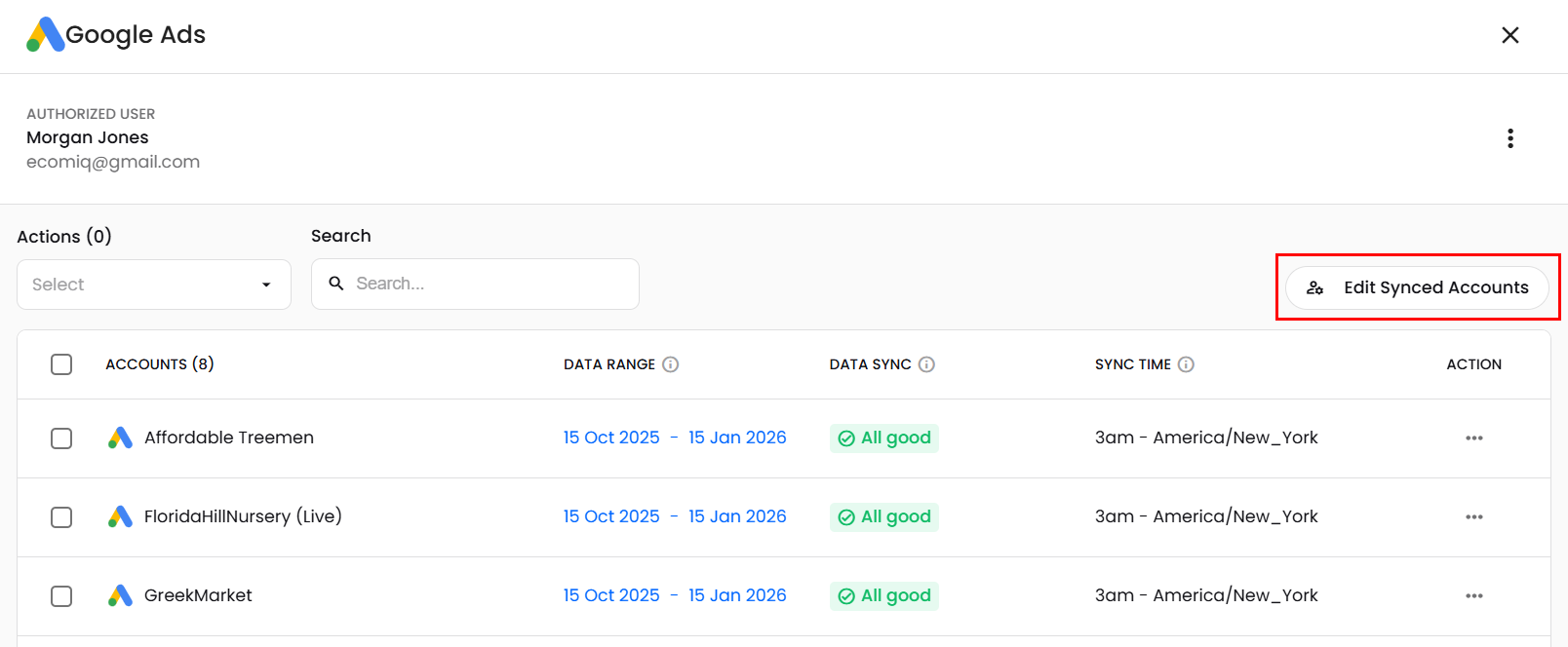 You can enable or disable accounts at any time using the Manage Accounts panel. Disabled accounts will stop syncing new data but can be re-enabled whenever you need them.