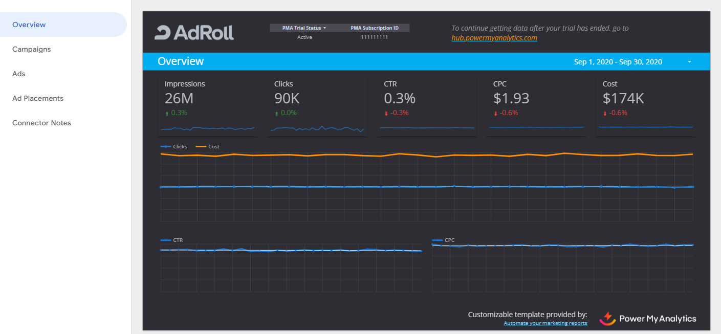- Data Refresh Time: AdRoll data in Power My Analytics is updated daily at midnight in your local time zone.