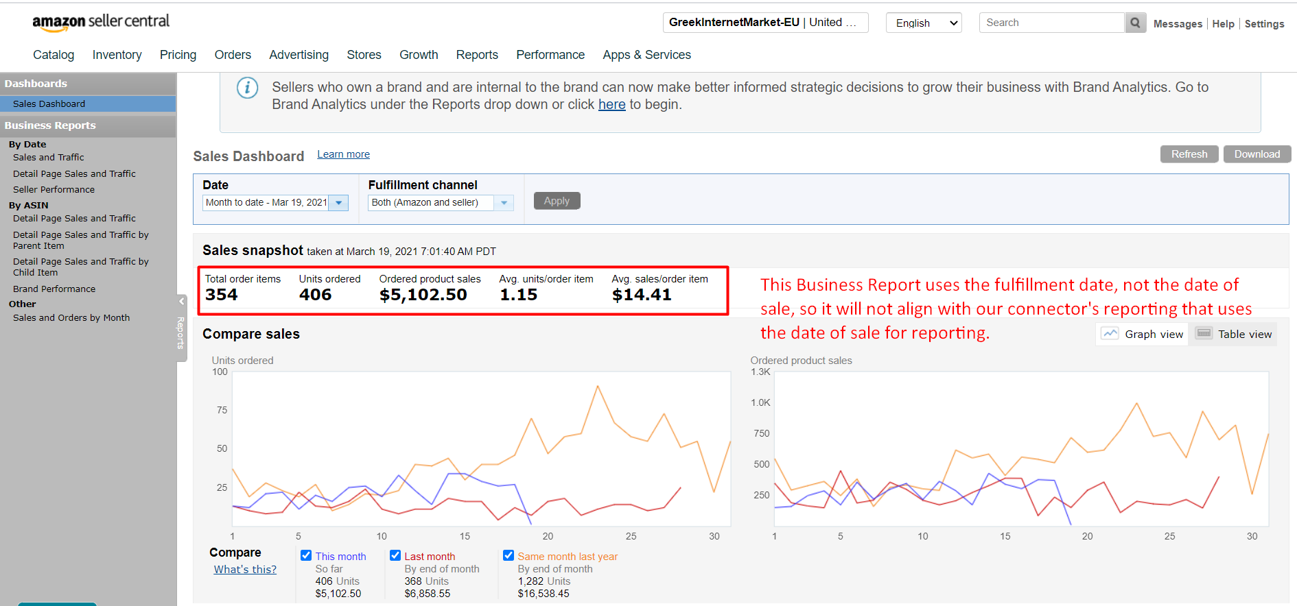 - Sales reporting by date shipped: Sales reports are referenced by order date. If you attempt to compare Amazon's business reports to our connector's data, there will be a mismatch due to this key difference in sales reporting date.