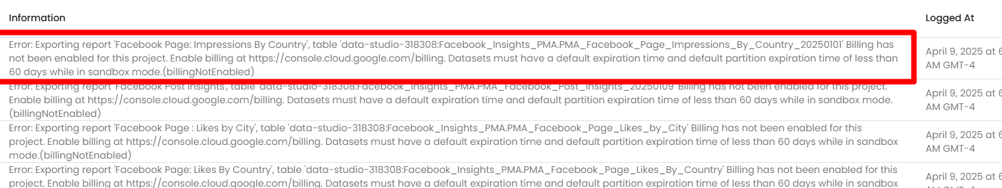 When attempting to run a BigQuery export of your Power My Analytics report, you may see the following error in the View Logs panel: