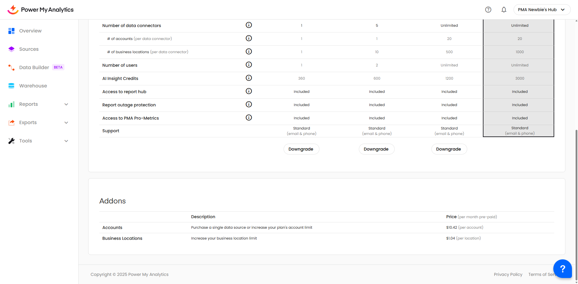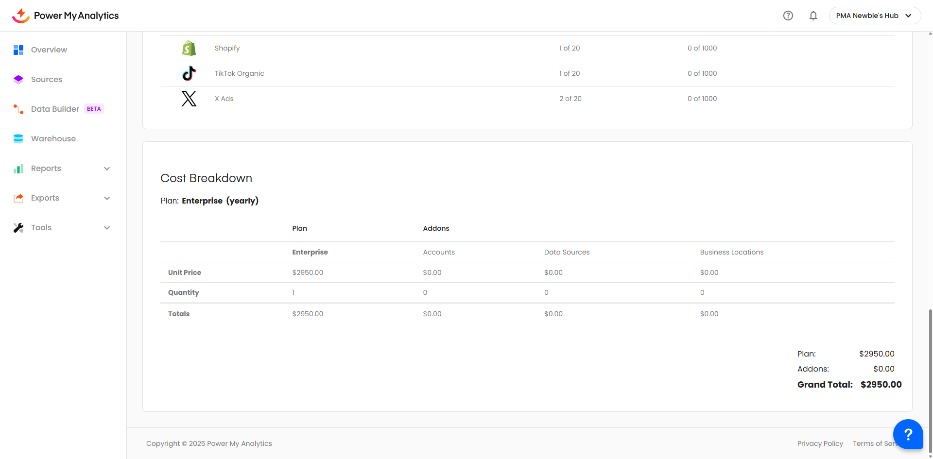 The Data Connector Breakdown shows how many accounts or business locations are being used by each connector. Scroll down to see your Cost Breakdown, which includes the grand total of your base plan and all addons.