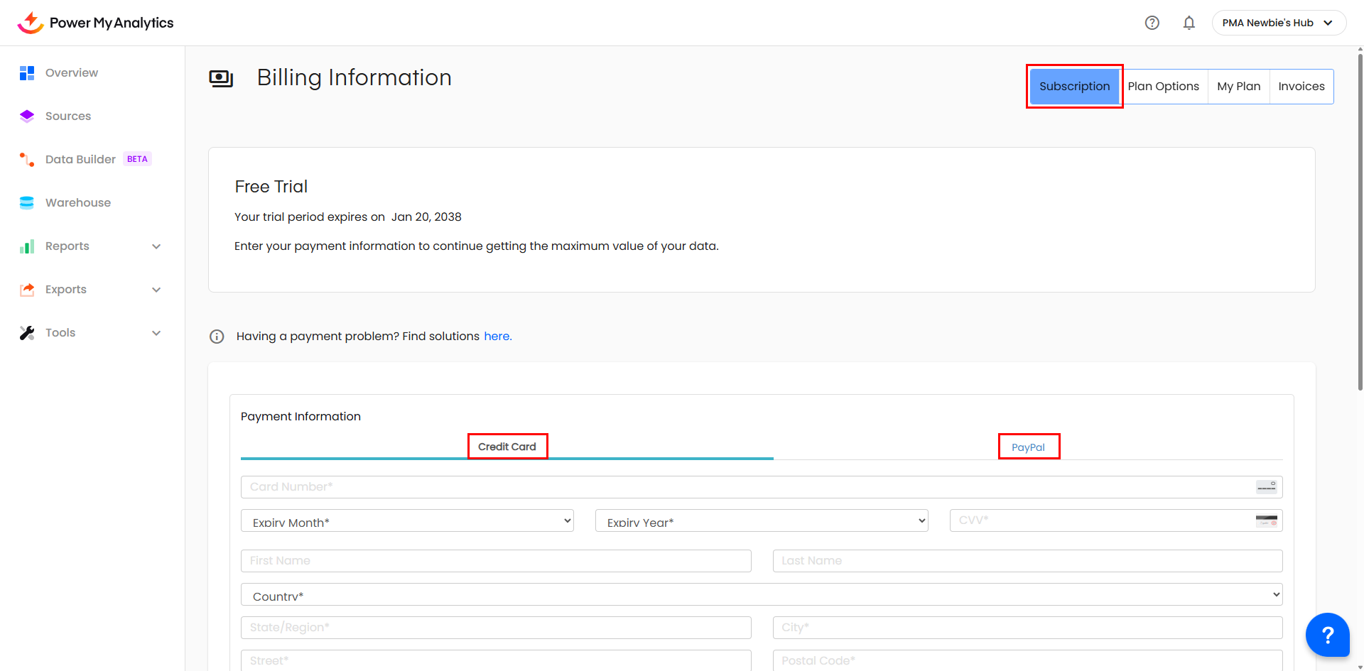 To enter your payment information or change your payment method, go to Billing → Subscription.