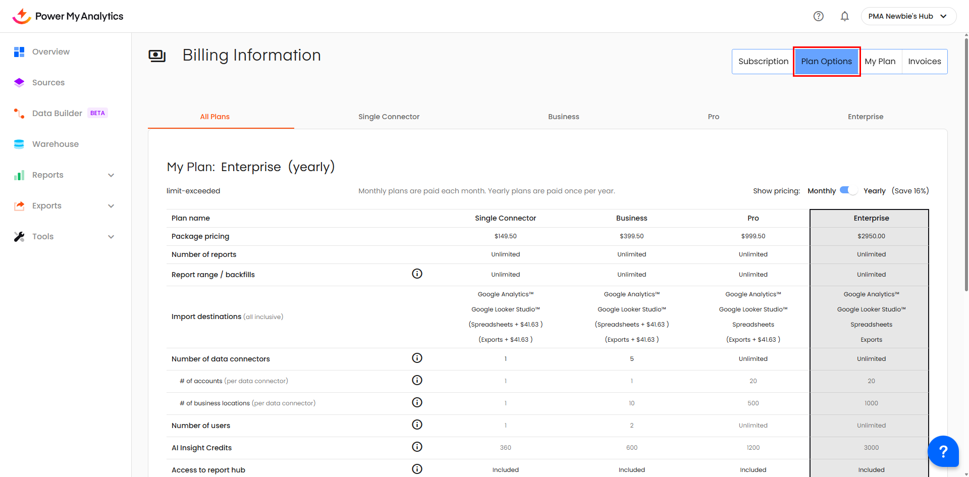 To see an explanation of your bill, go to Billing → My Plan. You’ll see your current plan listed under Explain My Bill, along with a list of the users in your hub and the number of data connectors you’re using.