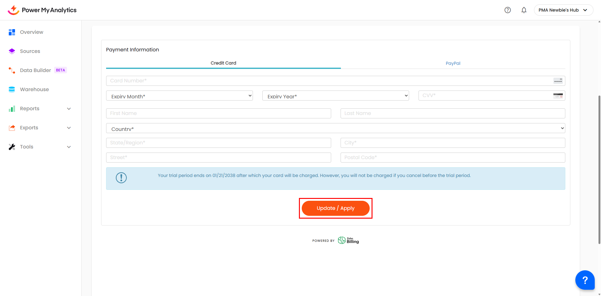 Under Payment Information, choose from credit card or PayPal. Enter your payment information and click Update/Apply.