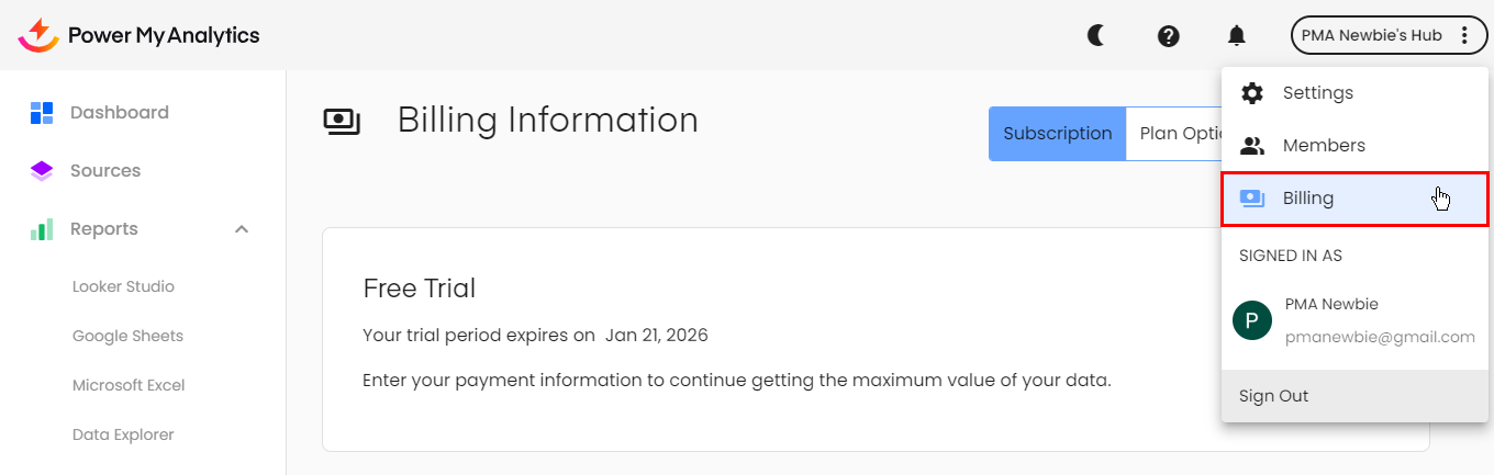 Follow these instructions to activate your expired Power My Analytics trial. Begin at hub.powermyanalytics.com Log in as the hub owner for the subscription that you wish to reactivate. Only the hub owner can manage the subscription. If you see a ...