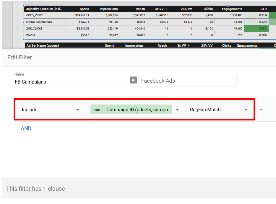 Create a filter on your table. Choose Include > Campaign ID (ad sets, campaign insights, campaigns, insights) > RegExp Match.