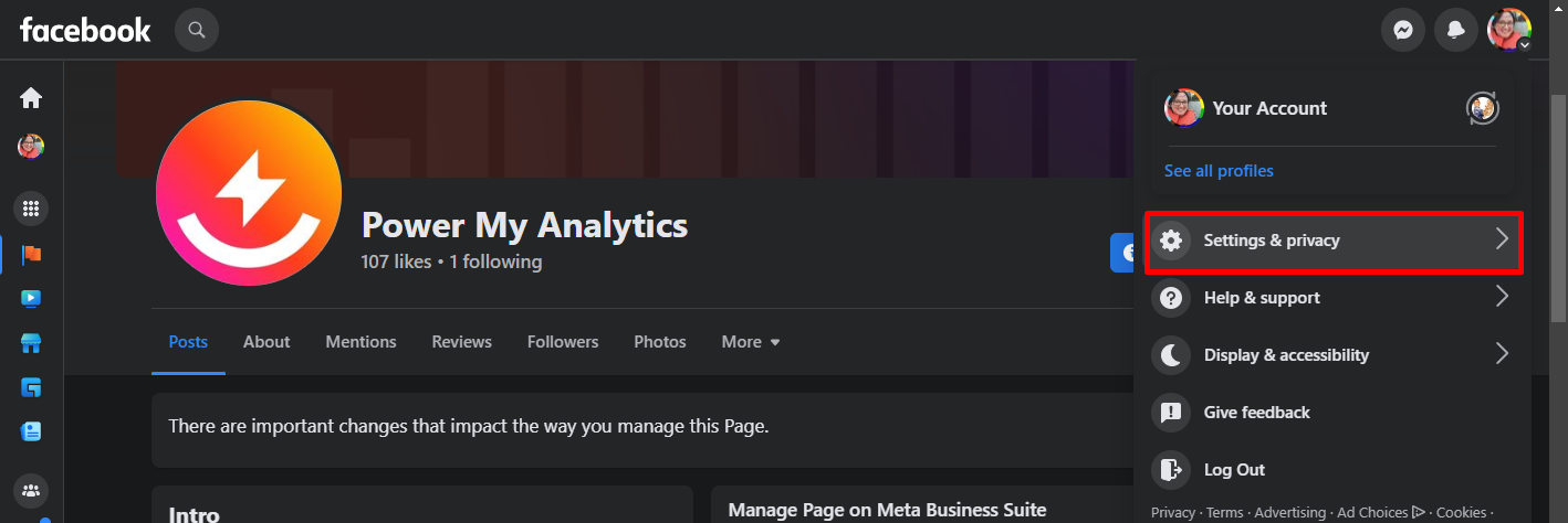 Select your page. Click on your profile picture and select Settings and Privacy from the menu that appears.