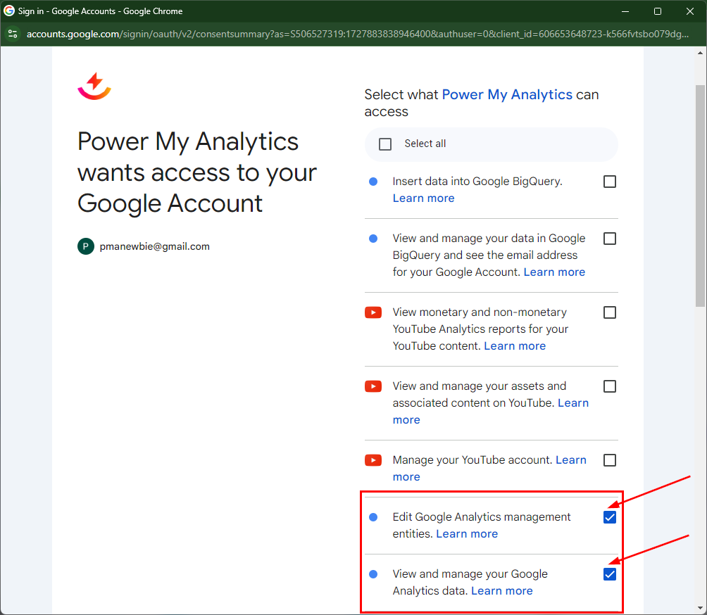 Power My Analytics' connector will never edit, create, or delete anything in your Google Analytics 4 account. Google does not provide a read-only option for permissions.