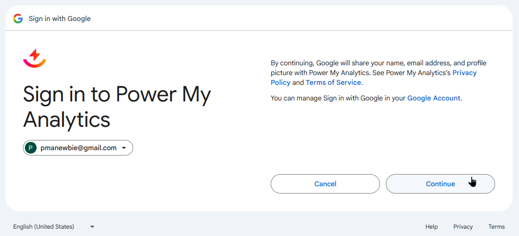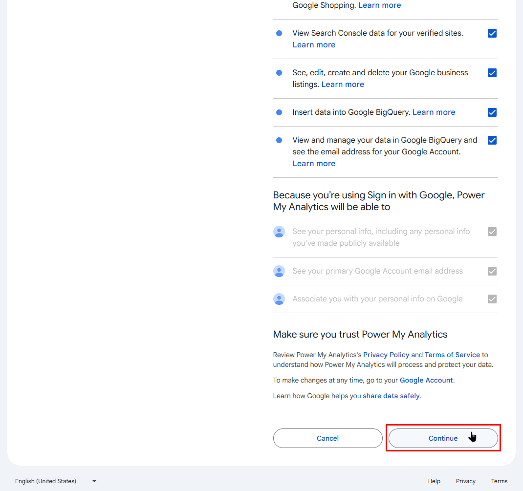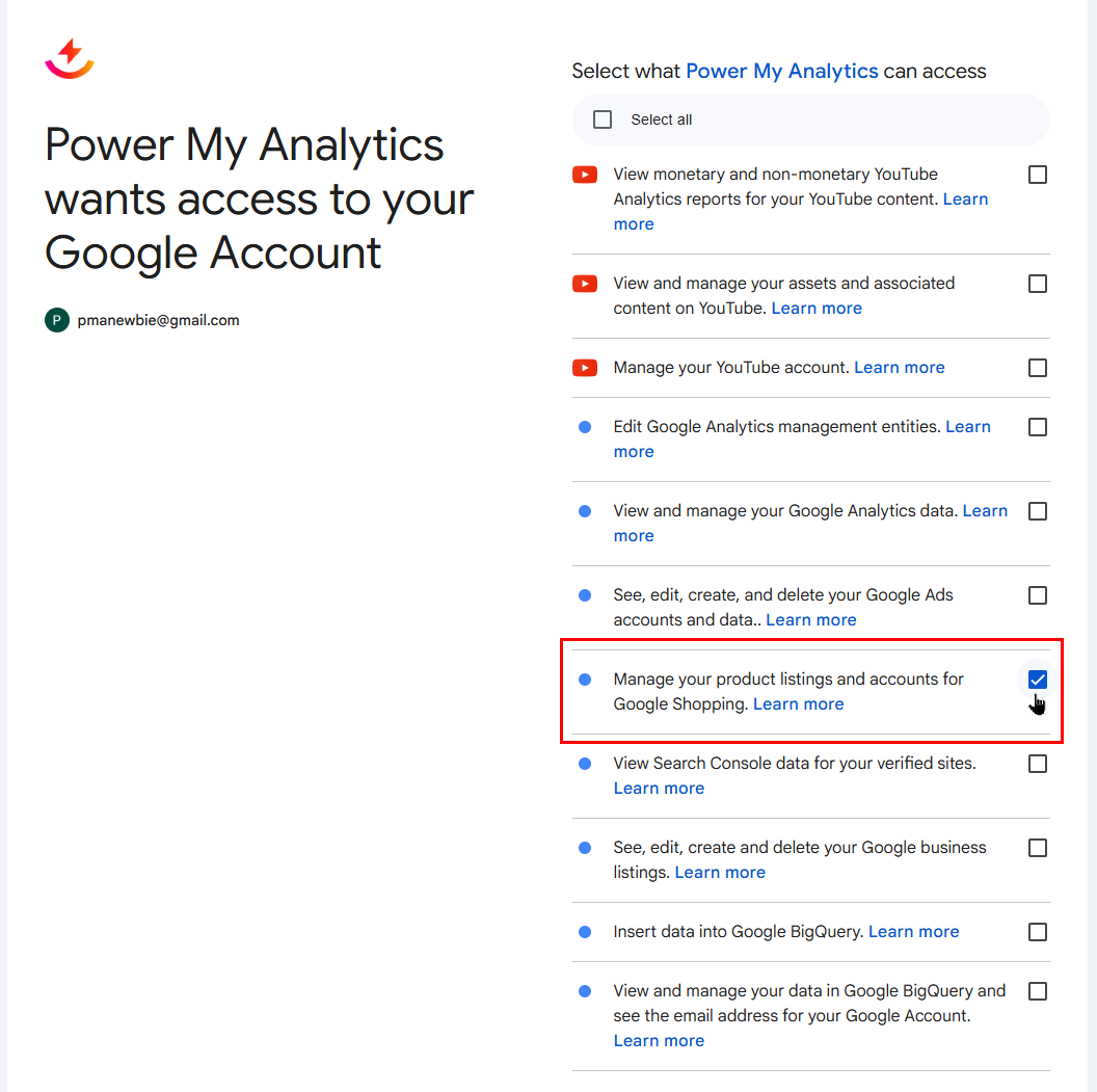 Power My Analytics' connector will never edit, create, or delete anything in your Google Merchant Center account. Google does not provide a read-only option for permissions.