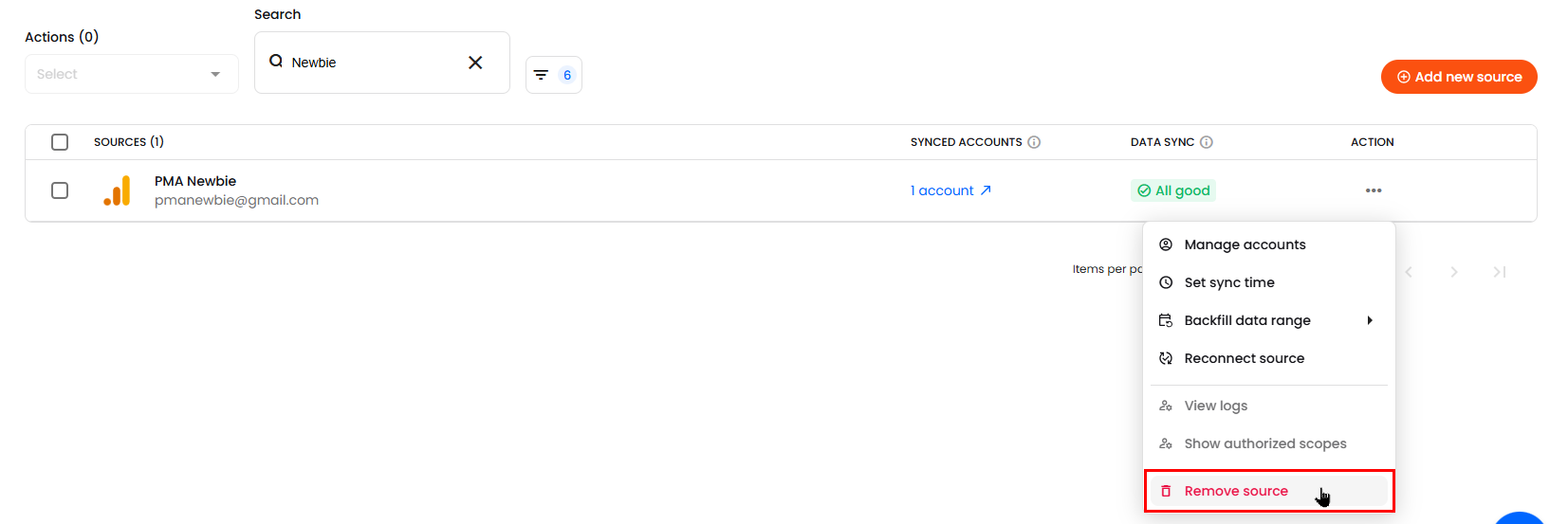 - Locate the Google account you wish to remove. Click the three dots next to the account to open the action menu, and select Remove source.