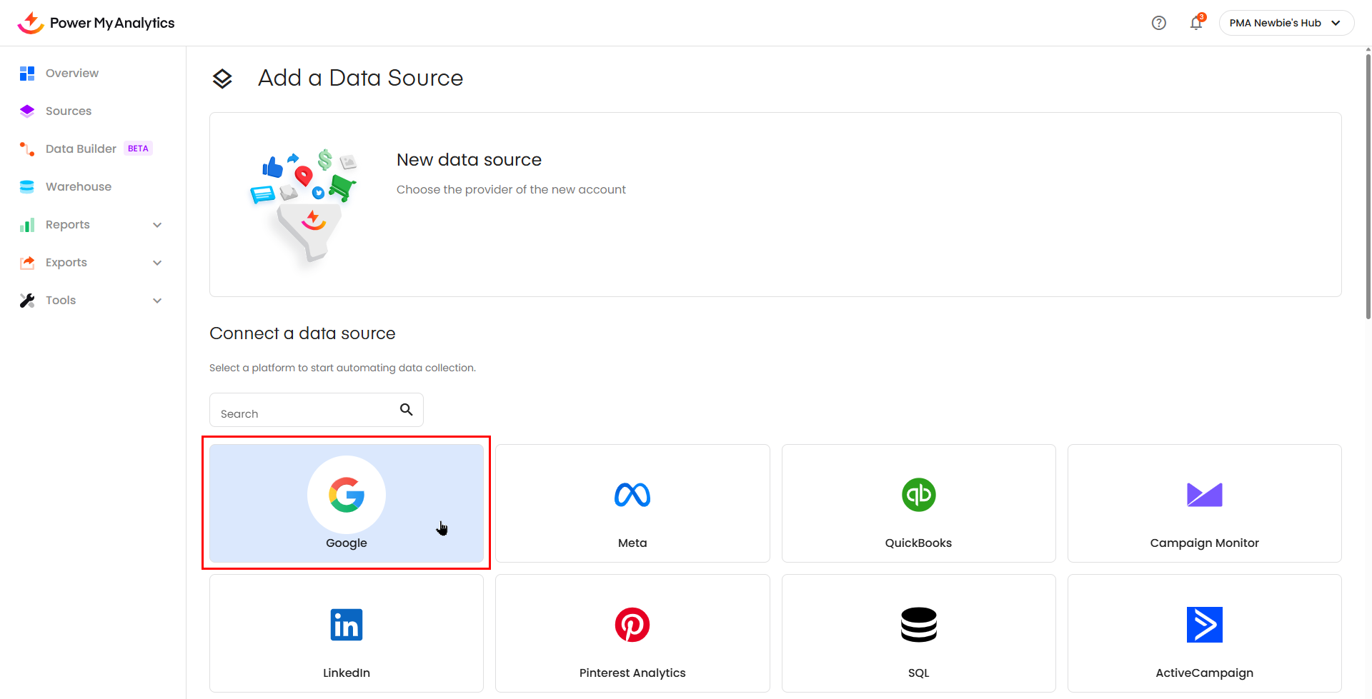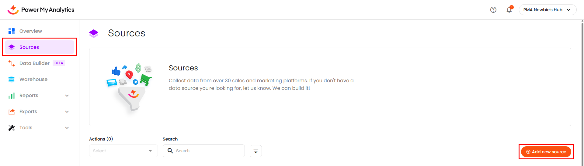 - In your Power My Analytics hub, click on Sources in the left navigation panel.