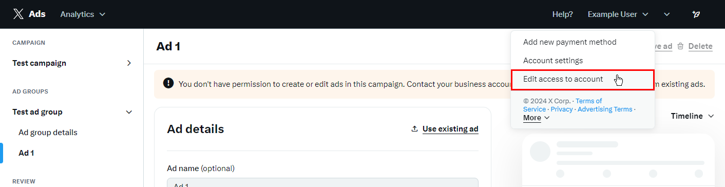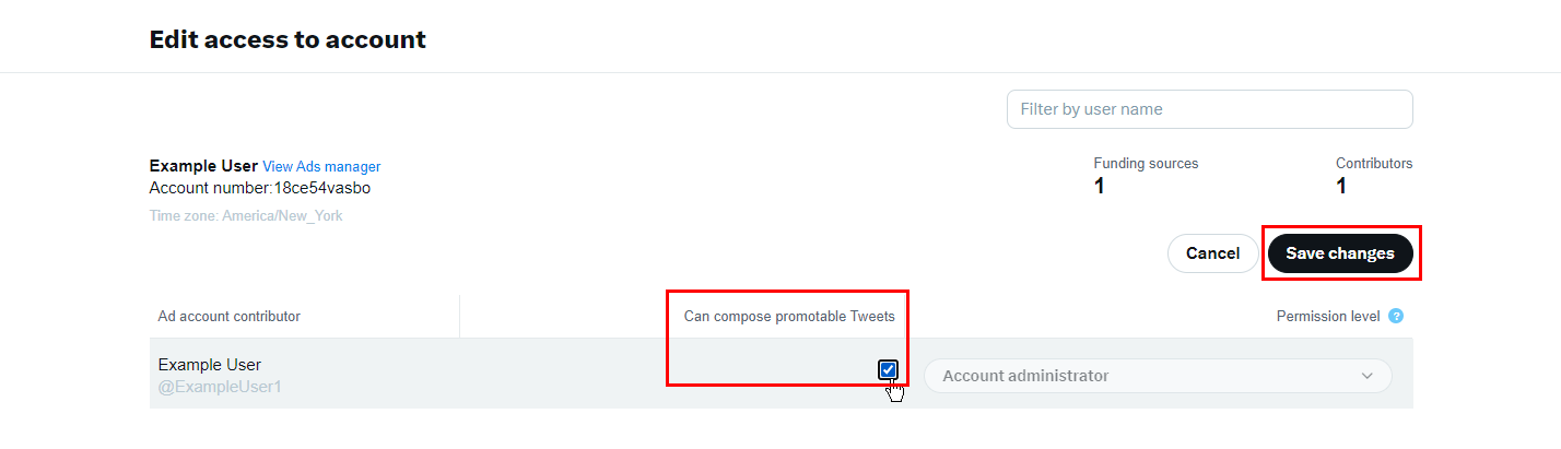 8. Click Edit access and check Can compose promotable tweets . Remember to click Save Changes.