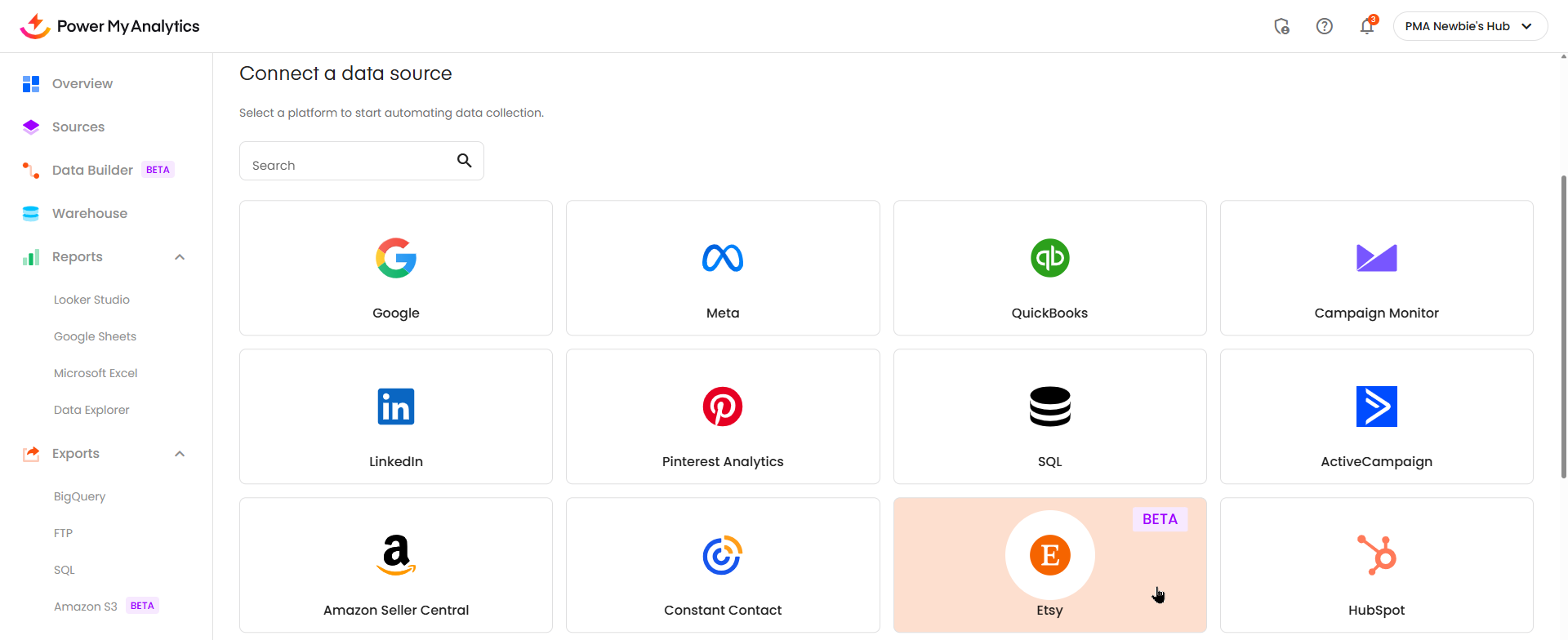 You will be redirected back to Power My Analytics, where your Etsy account will now appear in your Sources list.
