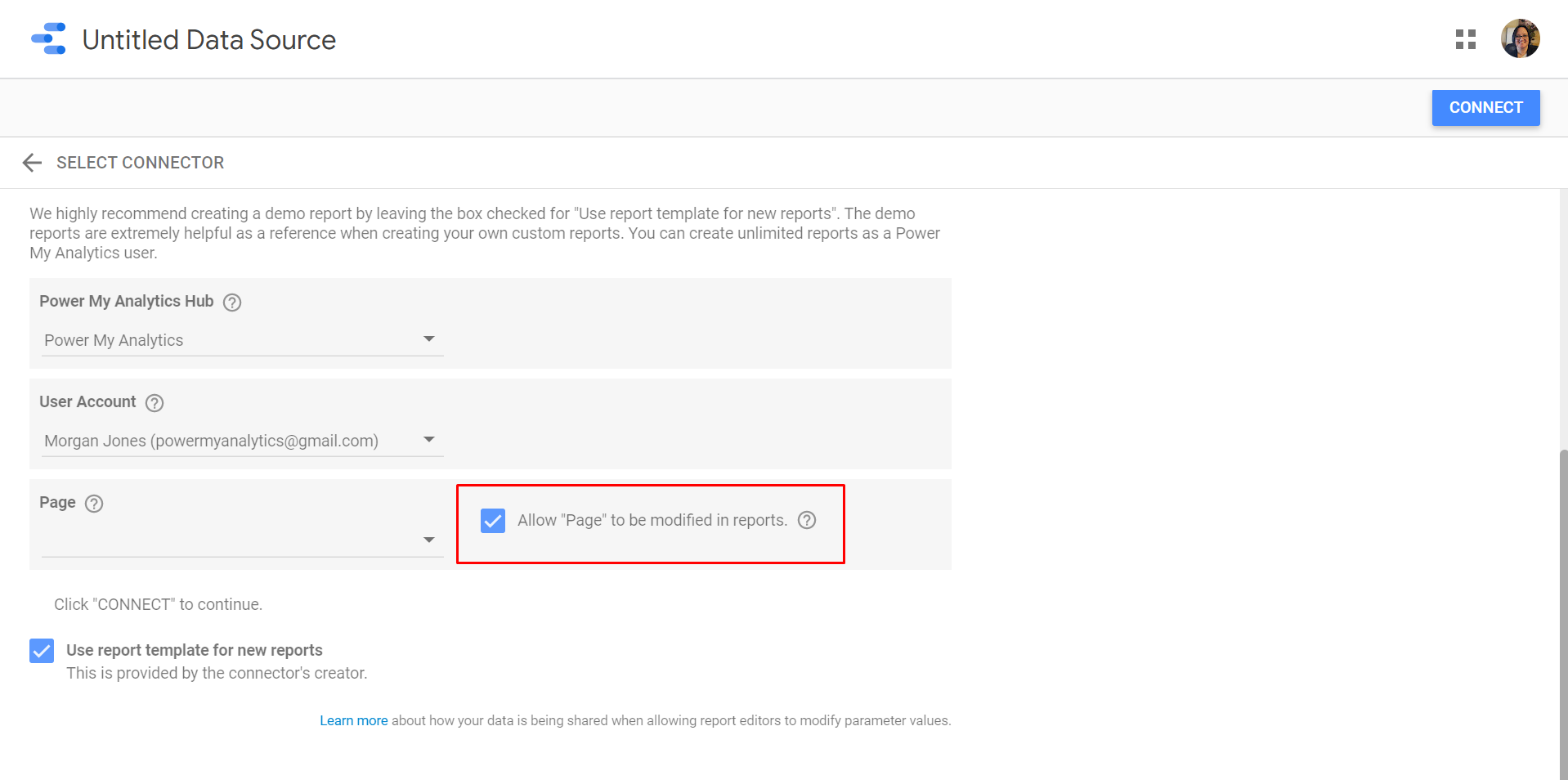 - On the connector configuration page, select Allow "page" to be modified in reports.