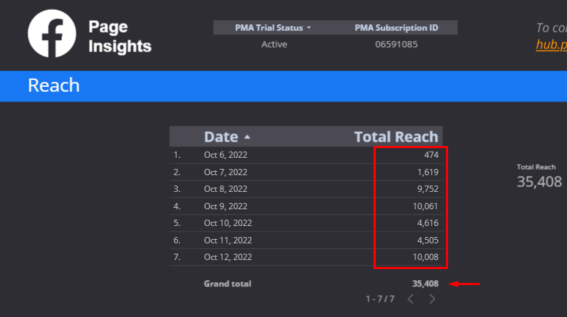 For this reason, Total Reach values may be larger than Lifetime Reach values. This figure is accurate and is the same value shown in Facebook Insights UI for weekly reach.