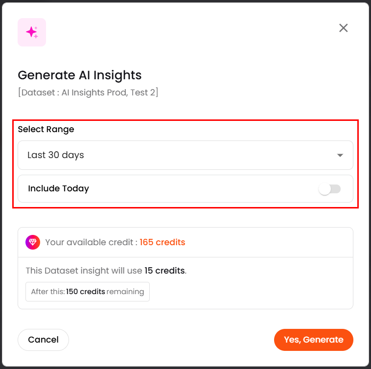 In the popup, go to Select Range and choose the date range of data to analyze from the dataset or table. Select Include today if you'd like to include the most recent live data from your data source.