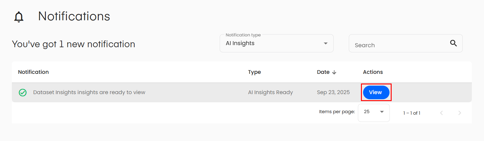 Once AI insights are generated for a dataset or a data table, those insights are cached and can be viewed at any time by clicking Get AI Insights for the dataset or data table again, or by going to the notifications section of your hub.
