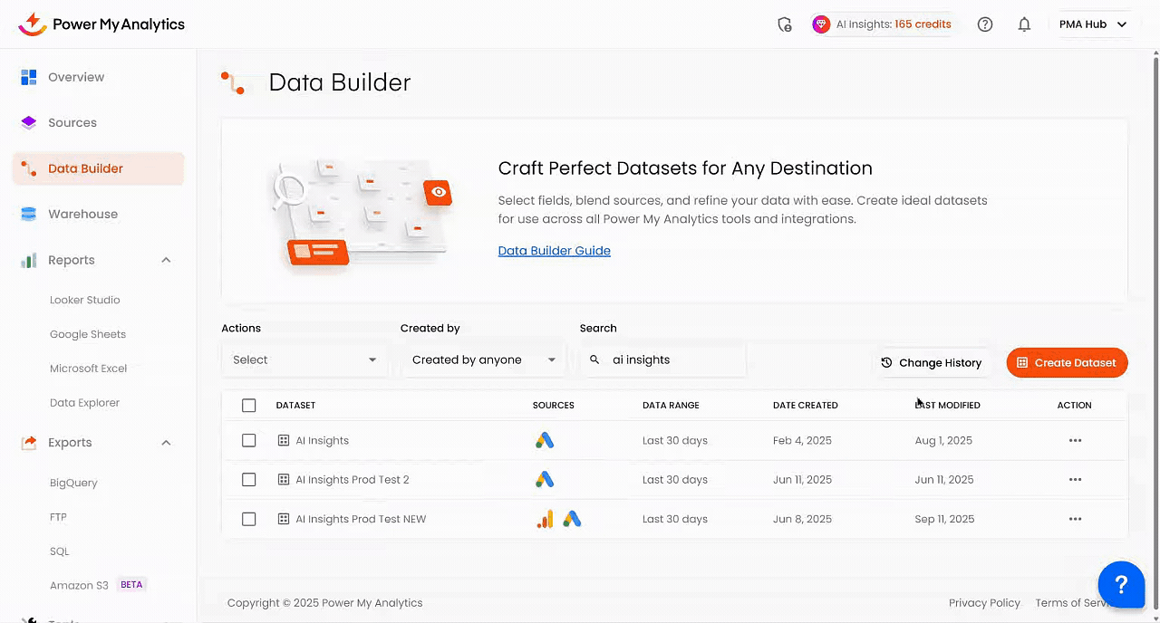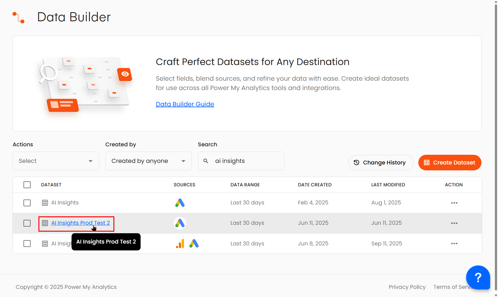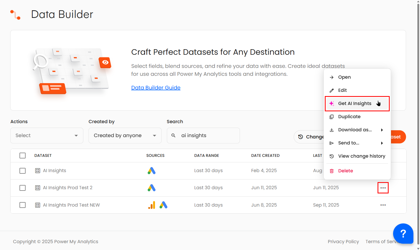 Power My Analytics now offers AI Insights for intelligent analysis of your datasets and data tables in our Data Builder. With AI Insights, you can identify performance trends in your report data and find strategies for success in your campaigns, marketing, and more.