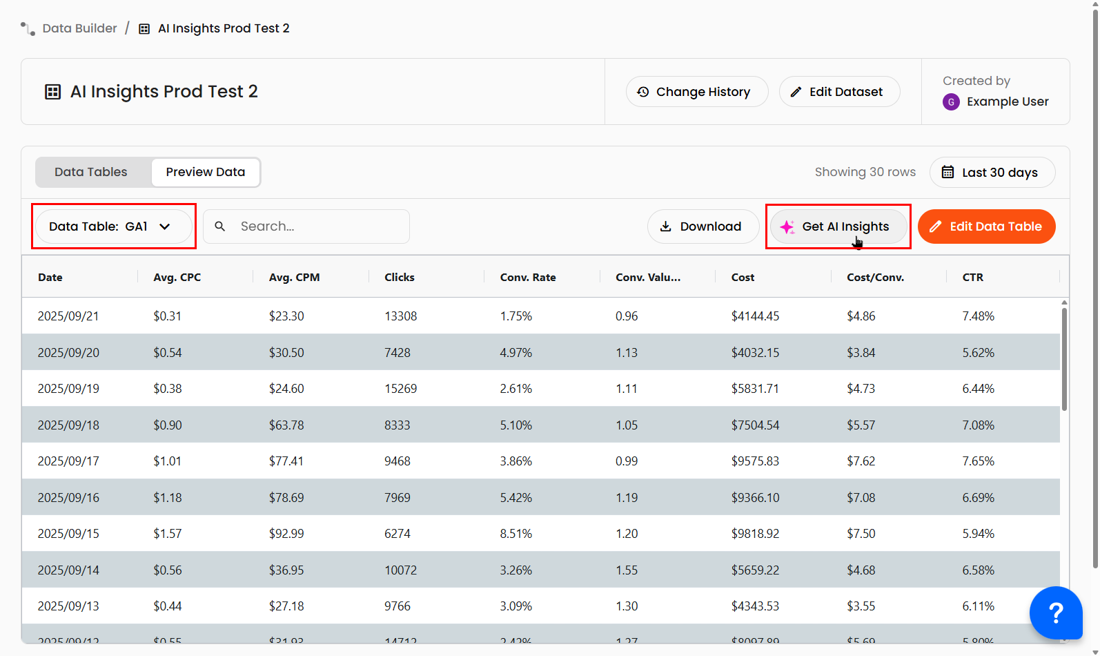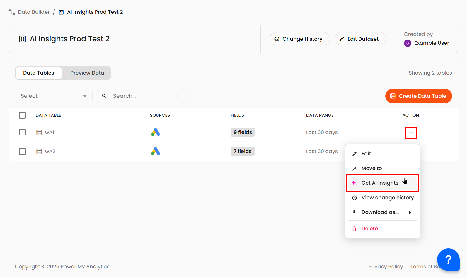 You can also click the Get AI Insights button when previewing a data table or tables in Data Builder. Make sure the correct table(s) are selected in the Data Tables dropdown on the left.