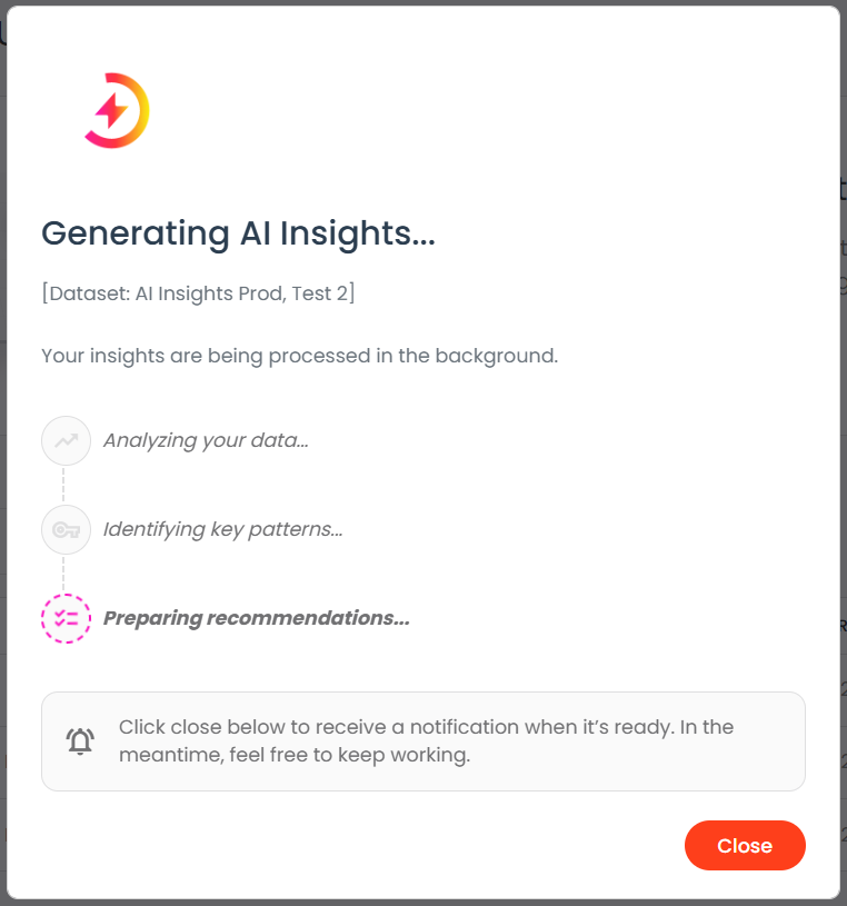 While your insights are generating, you can click Close and leave the page, and you’ll receive a notification in your hub when your insights are ready to view. (You can also keep the popup open and wait for your insights to load.)