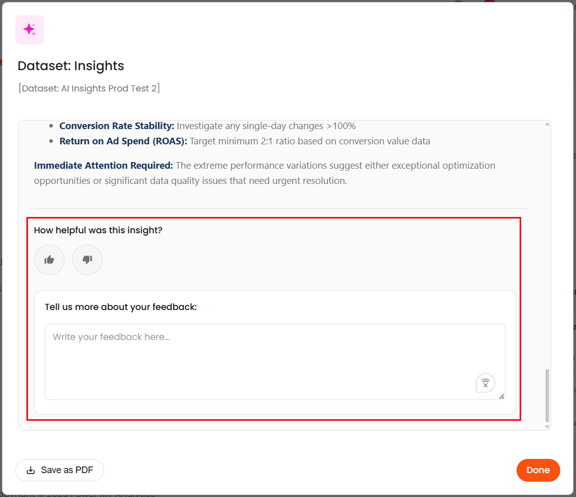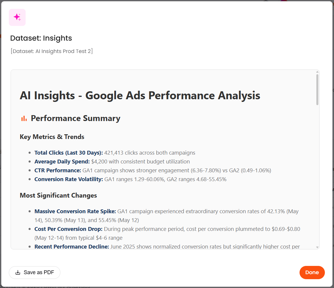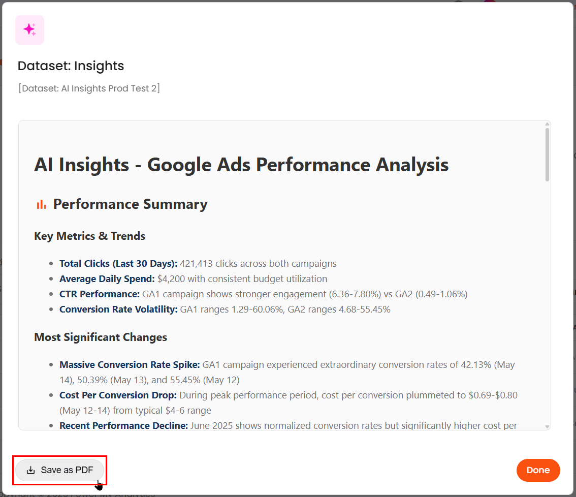 If you'd like to save a copy of your AI insights, click the Save as PDF button in the lower left corner of the popup: