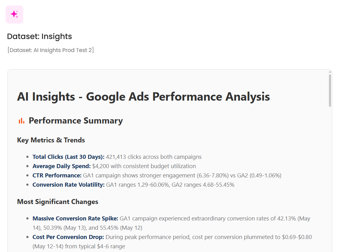 PMA will provide an AI-powered analysis and overview of the data in your dataset. This can include features such as key trends, significant changes and anomalies, top performing and underperforming areas, opportunities, and action plans.