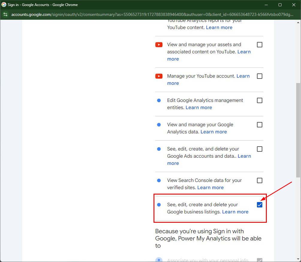 - Grant Power My Analytics the required permissions (See, edit, create, and delete your Google Business listings) for your Google account. Power My Analytics will never edit, create, or delete anything in your Google Business Profile account; Google does not provide a read-only option.