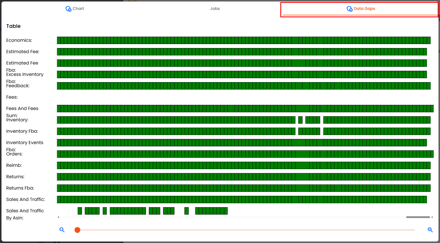 The Data Gaps display can be found in the Manage Accounts panel for a connected data source, under Actions > History for an individual account.