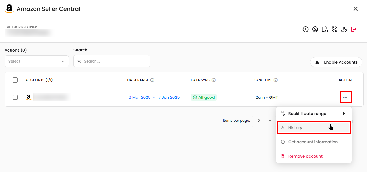 Accounts under a connected data source can be viewed in Action > Manage accounts.