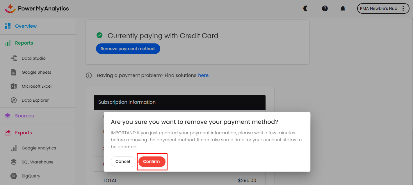 Your credit card is now removed as a payment method. When you are finished, remember to select another payment method for your PMA subscription.