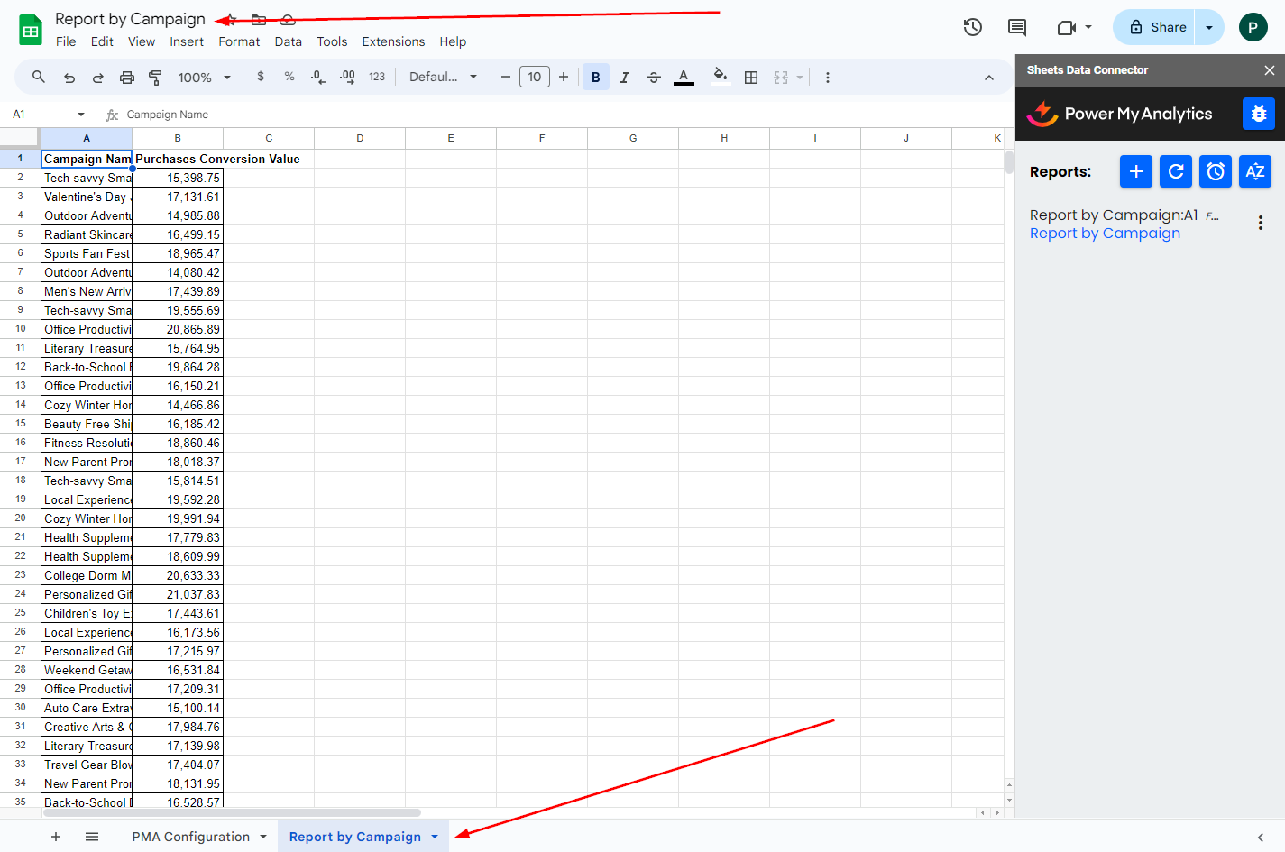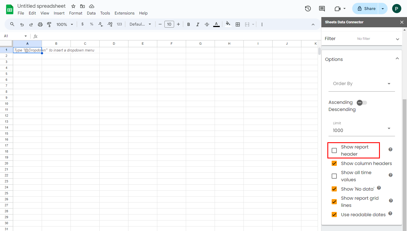 This article will assist with the following issue: A Google Sheets report is missing data or does not show enough data for a date range. Cause Power My Analytics' Google Sheets connector defaults to a 1,000 row limit. Solution Check the sidebar under ...