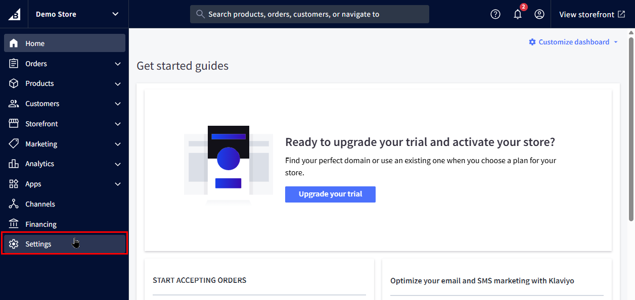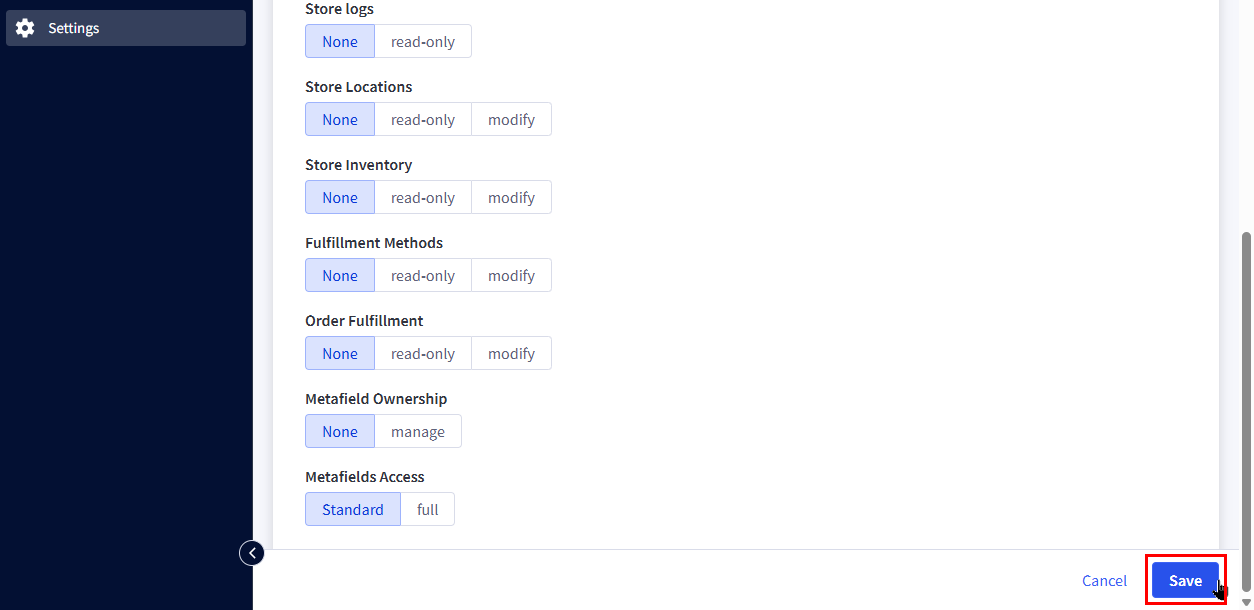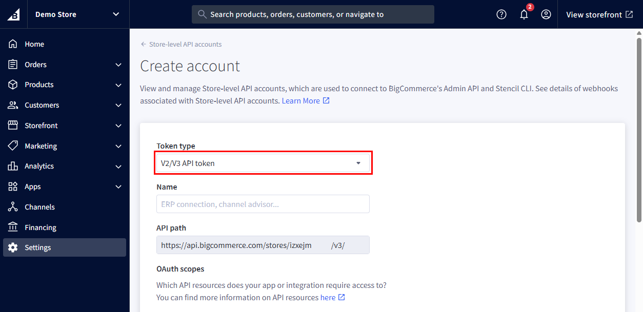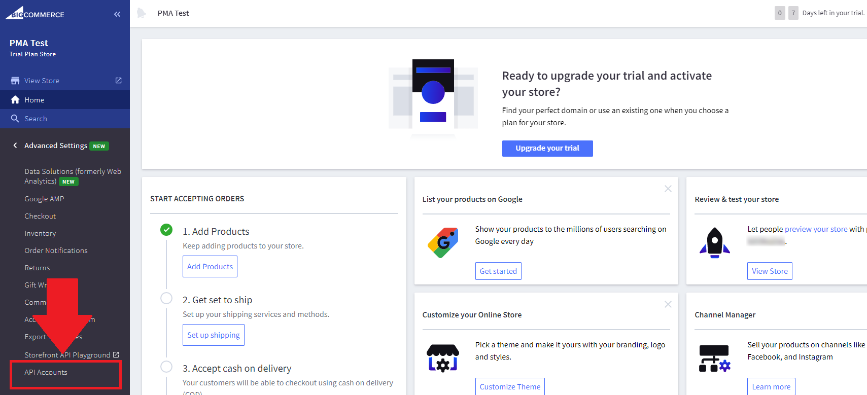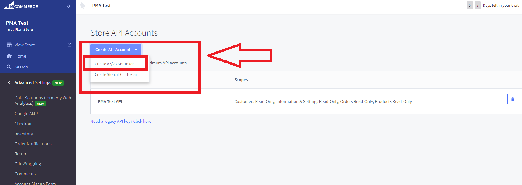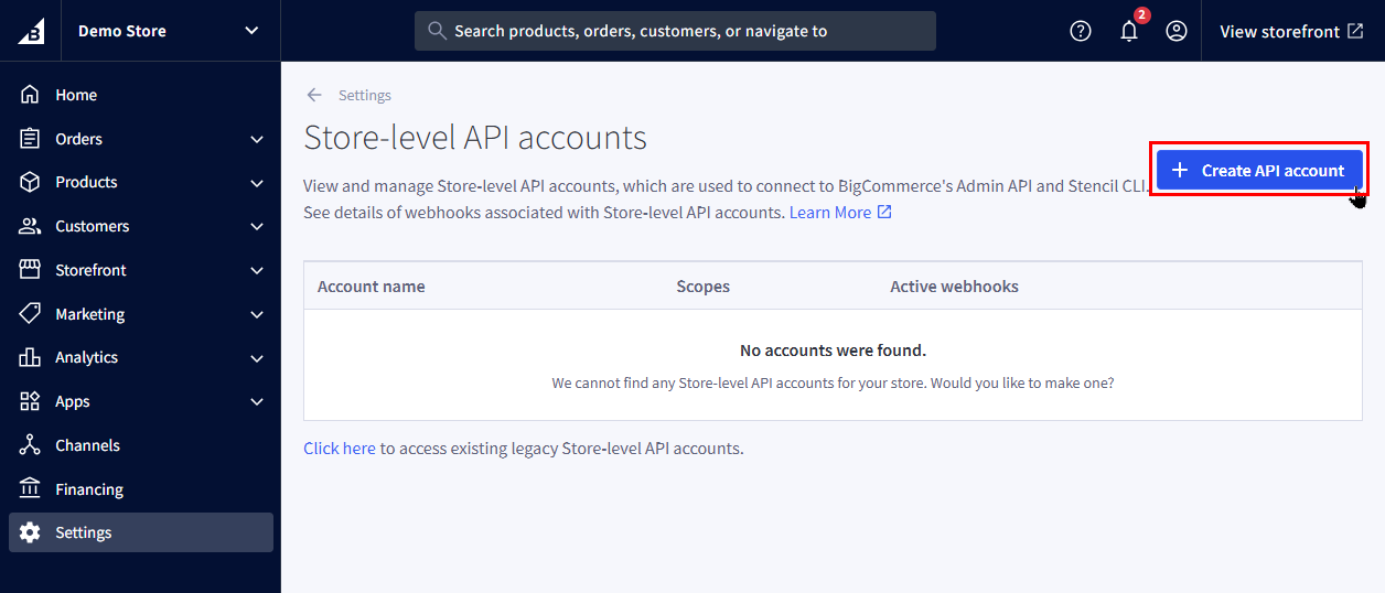 In Settings, scroll down to the API section and click on Store-level API accounts.