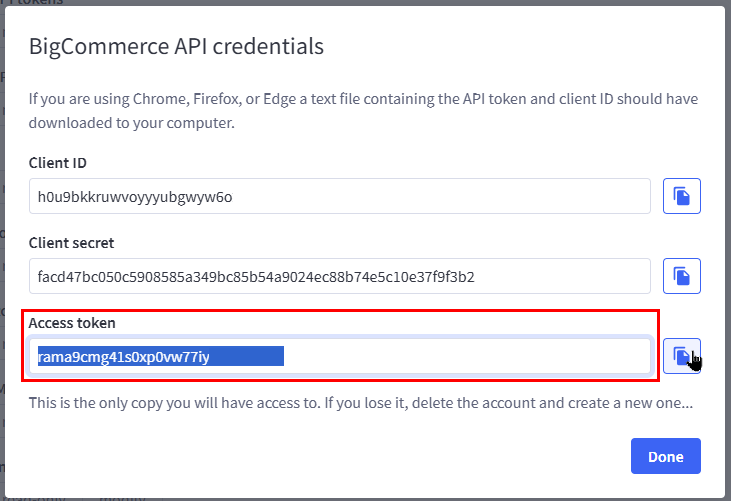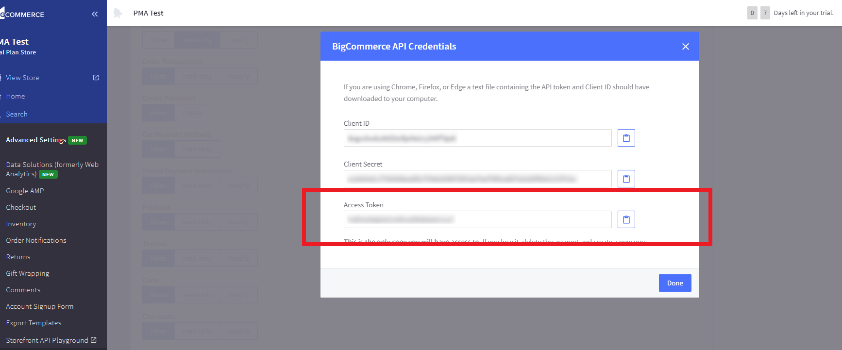 A popup will appear with your client ID, client secret, and access token. Copy and store your access token, as this will be needed when connecting your store to PMA.