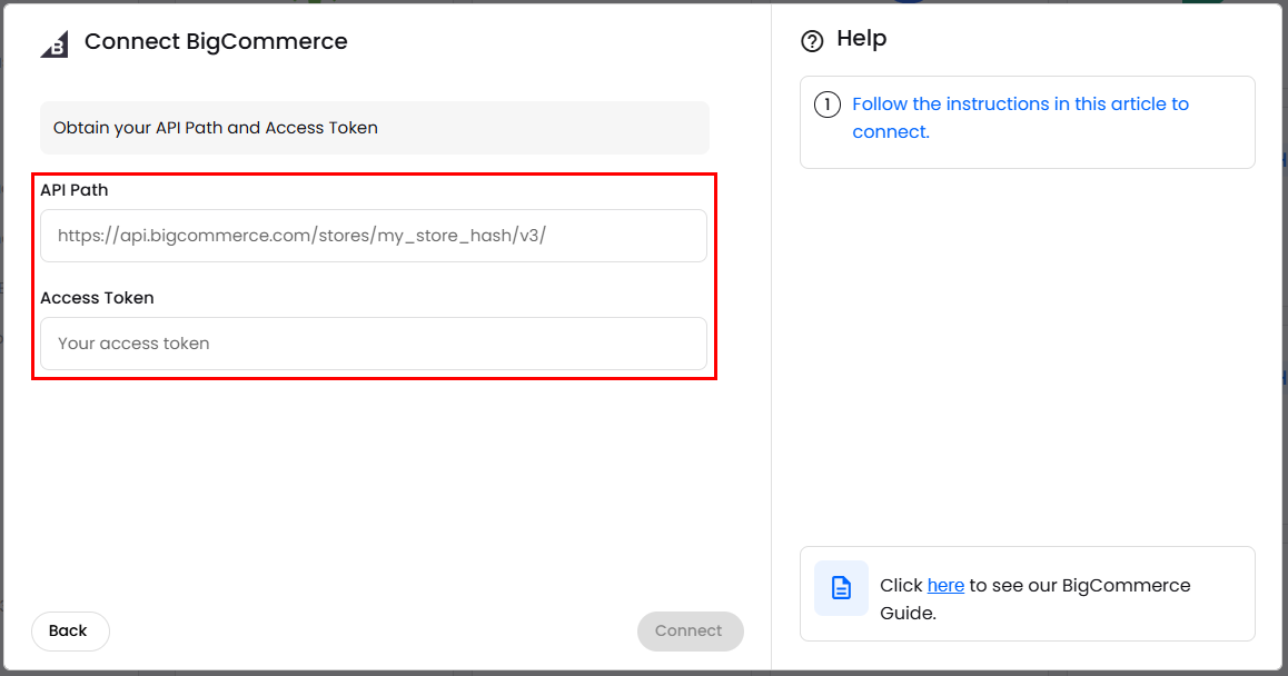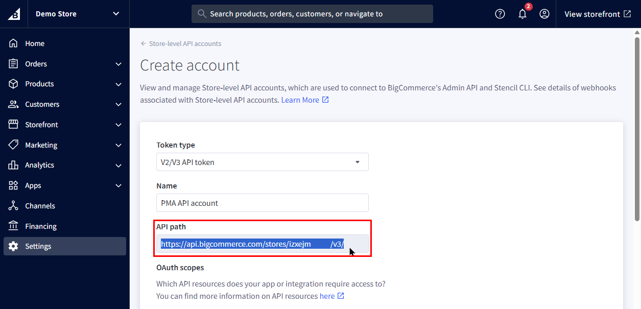 Select your API path and copy this information. You'll need to enter your API path into the Power My Analytics hub when connecting your BigCommerce store.