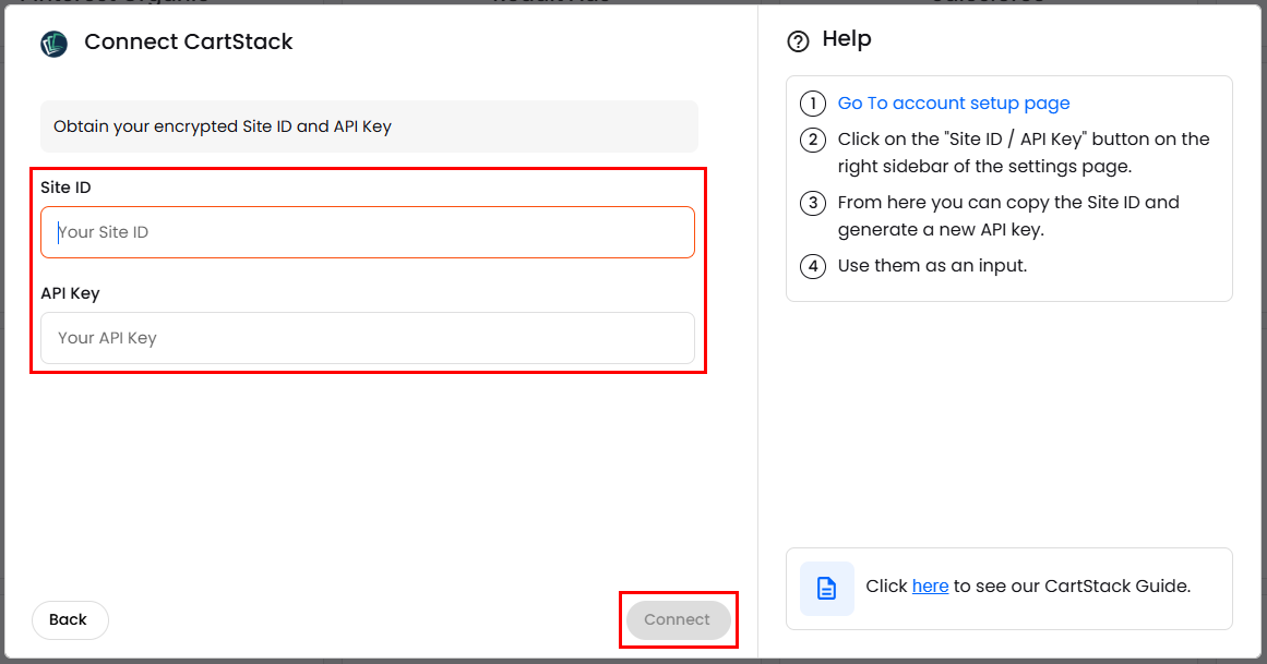 Your Site ID and API key can be found under Settings > Site ID/API Key in CartStack's UI: