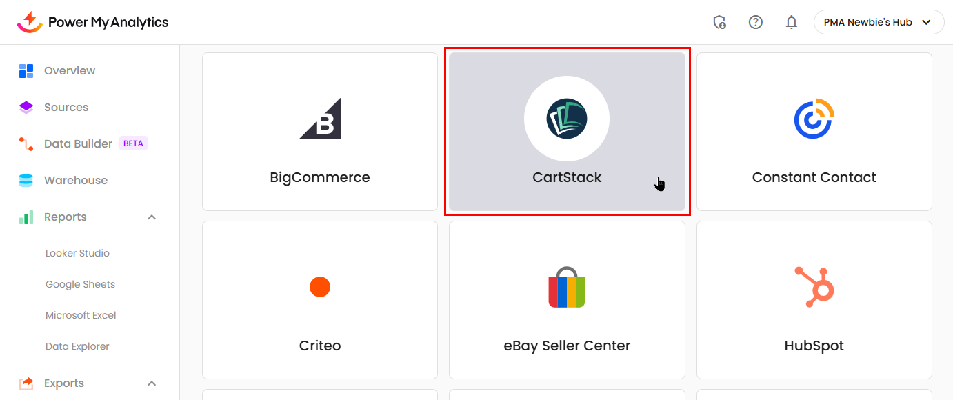 This guide will walk you through connecting your CartStack account as a data source in Power My Analytics. By integrating CartStack with our platform, you'll be able to automate your data collection, centralize your metrics, and create powerful reports to drive your e-commerce success.