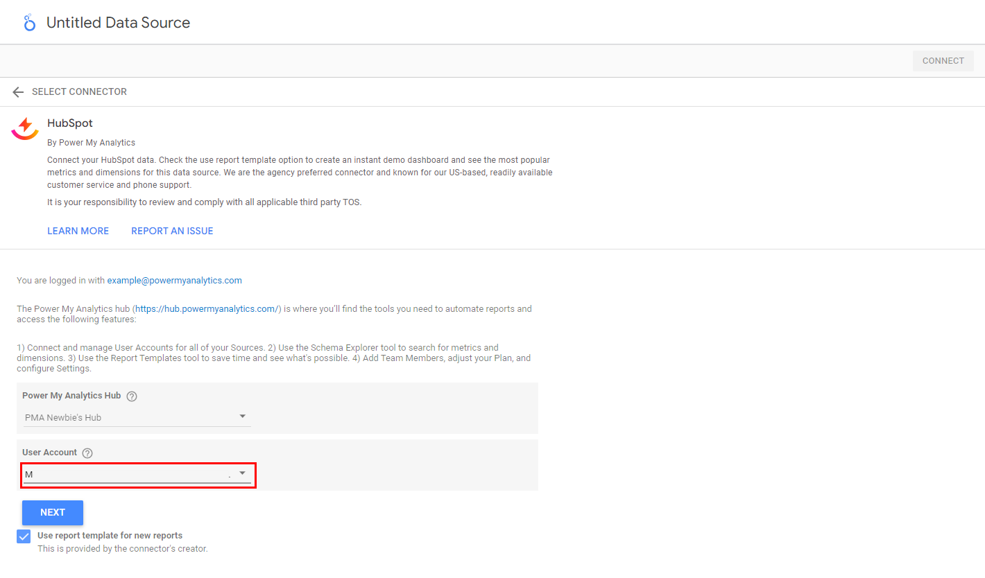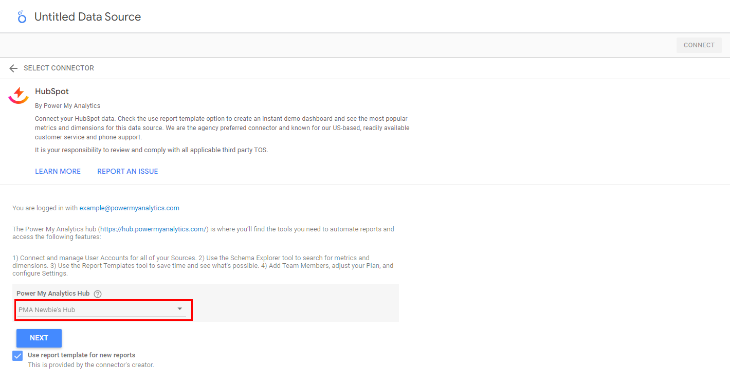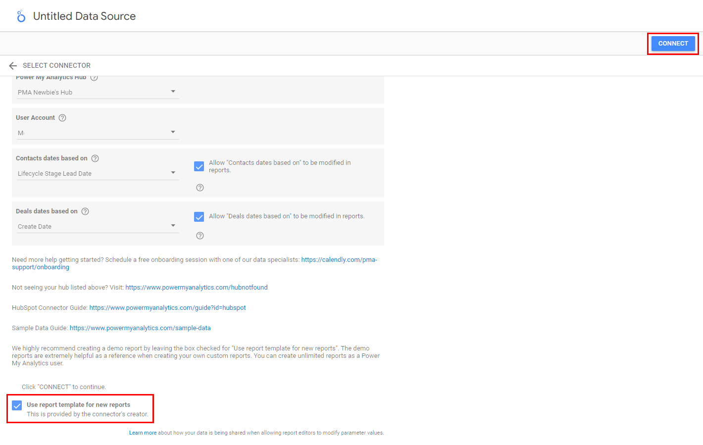 Leave the checkbox checked for Use report template for new reports to use our convenient pre-made templates. Click Connect to continue.
