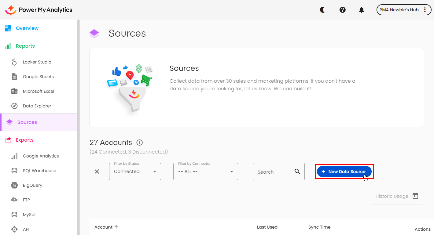 This guide will show you how to connect to Campaign Monitor and start creating reports. You can connect using your Campaign Monitor login or using your API keys. Begin in your Power My Analytics Hub. Under Sources, click + Add new source. Click ...
