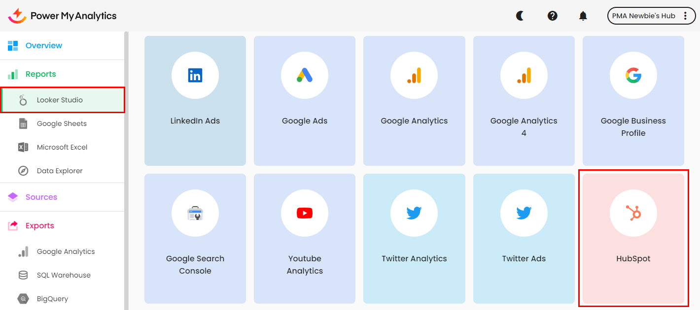 After authenticating, click Looker Studio under Reports in the left navigation pane. Select HubSpot from the gallery that appears.