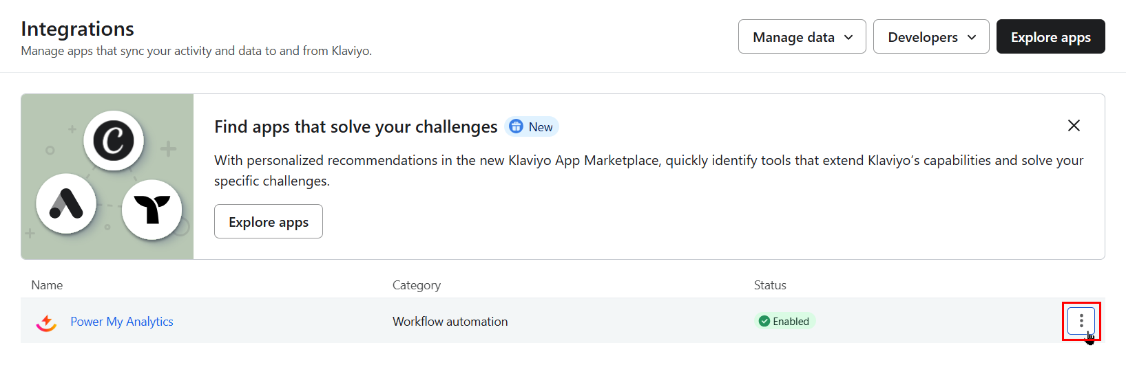 - Find the Power My Analytics app in the list of integrations, and click the three-dot action menu.