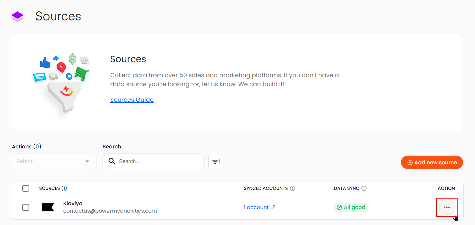 - Find your Klaviyo account in the list of connected sources. Click the three dots to open the Action menu.