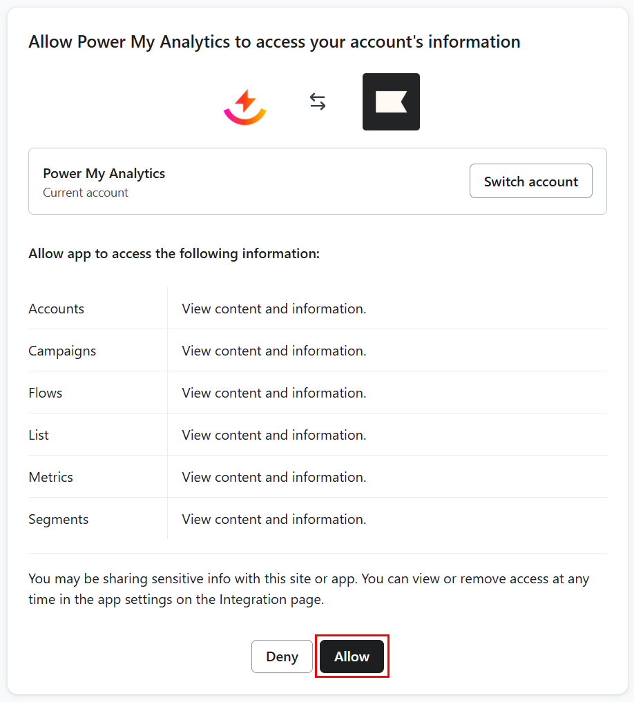 - On the next screen, click Allow to authorize PMA to connect to Klaviyo.