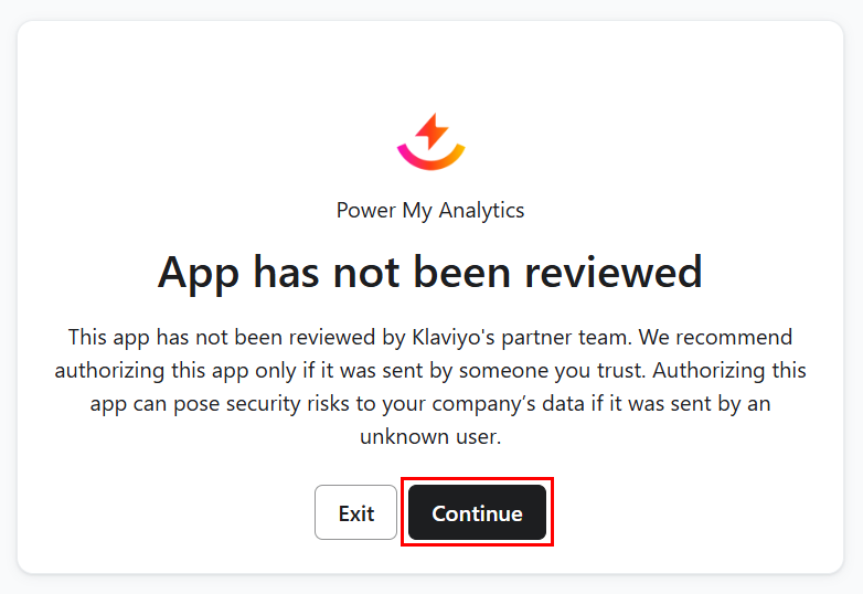 Beginning on June 3, 2025, users connecting to Power My Analytics with our Klaviyo connector will see a message indicating that PMA's app is "not yet authorized by Klaviyo". Temporary Authorization Notification for Klaviyo in June 2025 Starting on ...