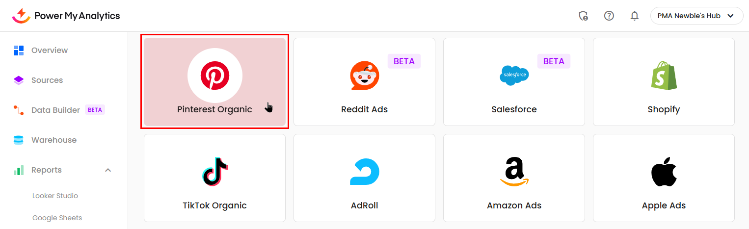 This guide will walk you through connecting your Pinterest Organic account as a data source in Power My Analytics. By integrating Pinterest with our platform, you'll be able to automate your data collection, create comprehensive reports, and gain deeper insights into your Pinterest marketing performance and audience engagement.