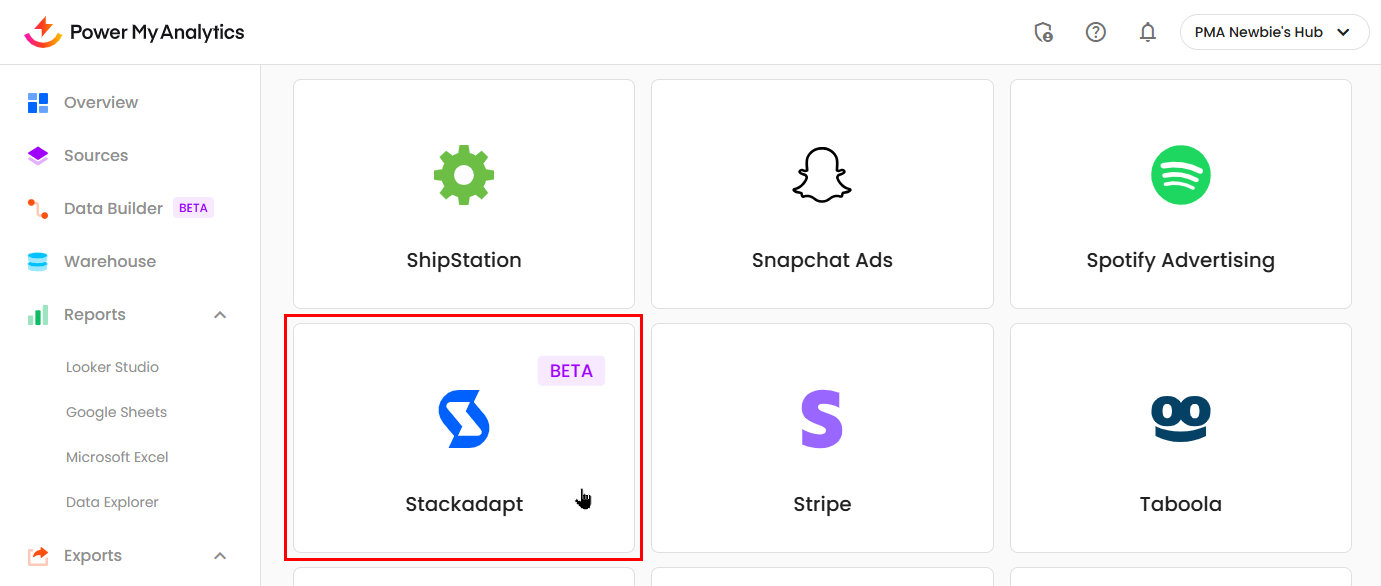 Once connected, StackAdapt will appear in your list of active data sources. Your advertising and campaign data from StackAdapt will automatically begin syncing to your Power My Analytics data warehouse. When the initial backfill is finished, you can then use this data in Looker Studio reports, Google Sheets, or export it to your preferred data destination.