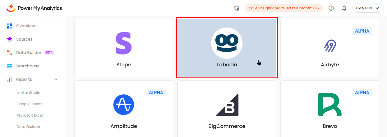Once connected, Taboola will appear in your list of active data sources. Your data from Taboola will automatically begin syncing to your Power My Analytics data warehouse. When the initial backfill is finished, you can then use this data in Looker Studio reports, Google Sheets, or export it to your preferred data destination.