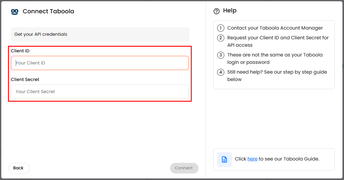 - You will need your client ID and client secret for your Taboola account to connect to Power My Analytics.
