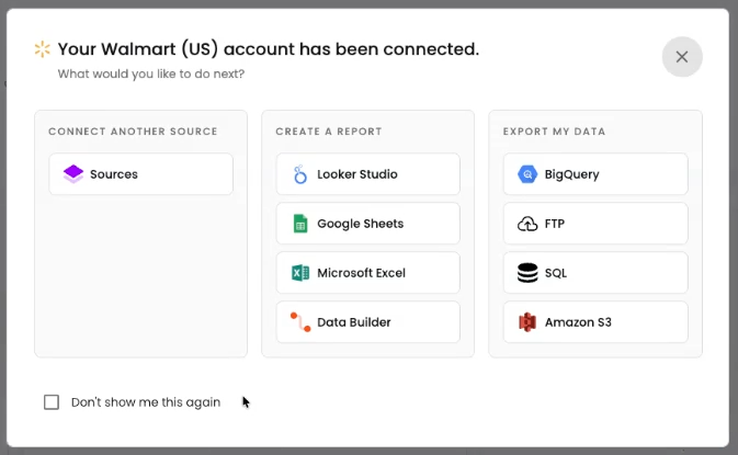 - Create a report – Build reports using your Walmart data in Looker Studio, Google Sheets, Microsoft Excel, or Data Builder
