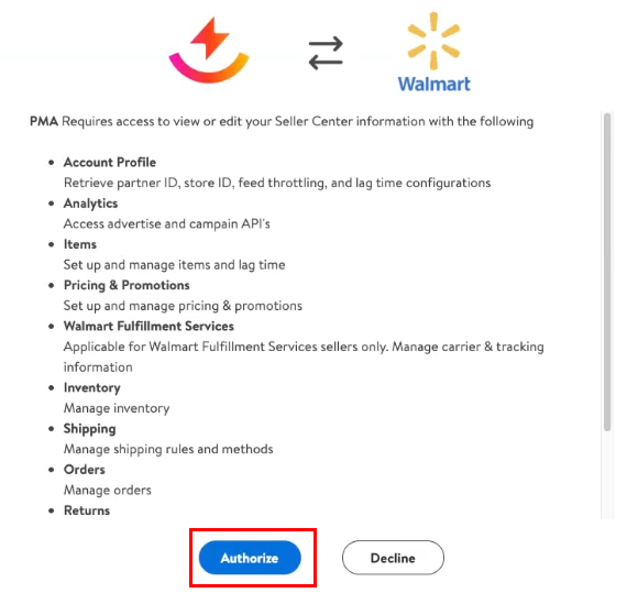 - You'll be prompted to authorize permissions for PMA to access your Walmart Seller Center information. Review the requested permissions, then click the Authorize button to continue.