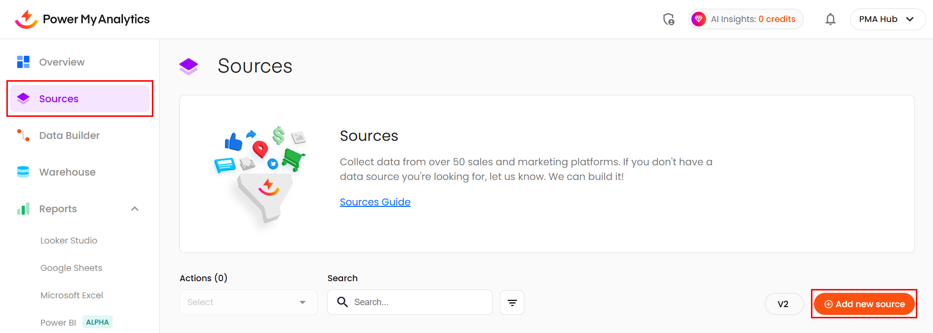 - Navigate to the Sources section of your Power My Analytics hub and click Add new source.